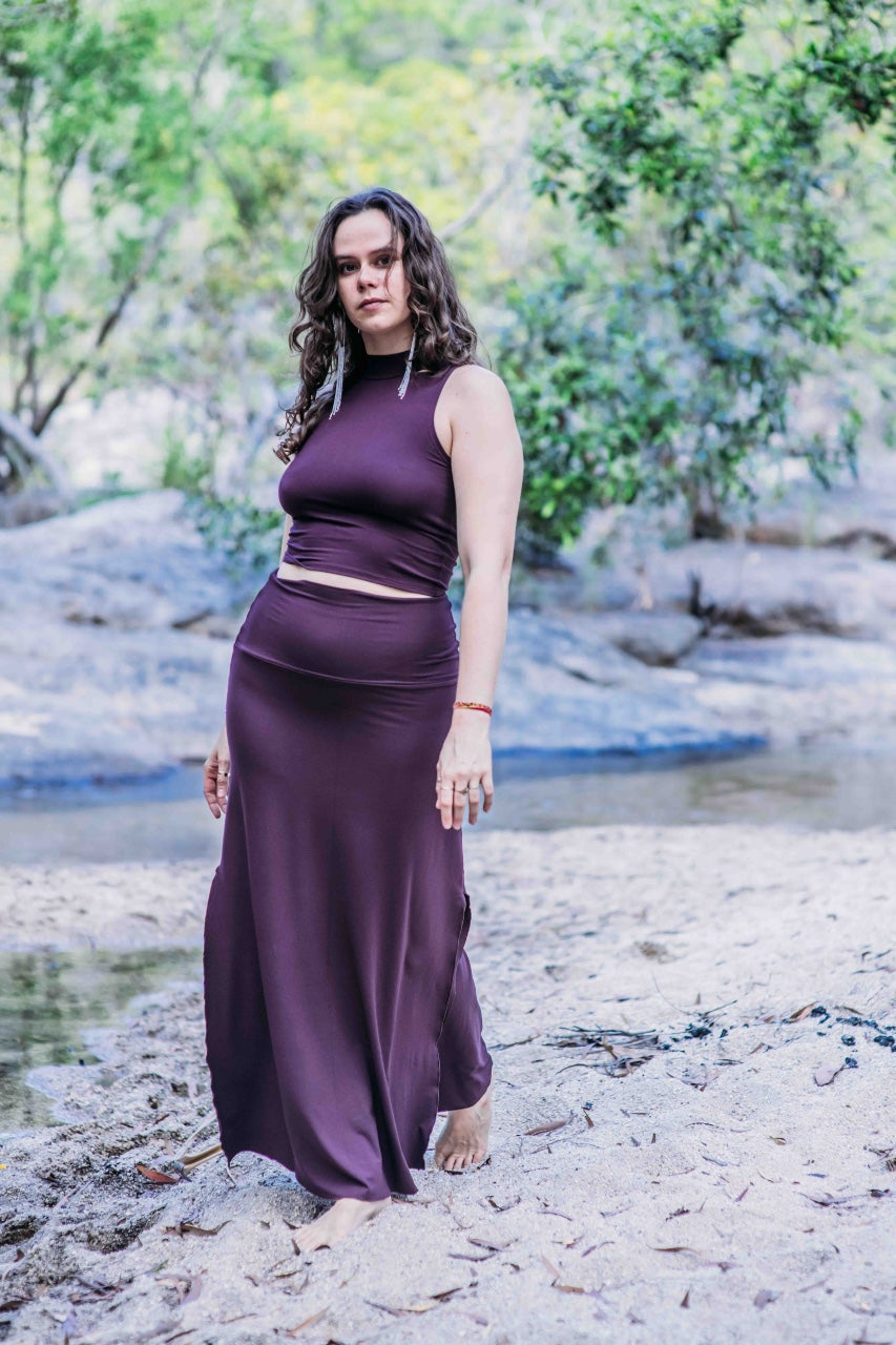 Handcrafted with care and intention in Bali, Indonesia, this elegant maxi skirt is crafted from soft, stretch bamboo viscose, offering both comfort and fluid movement. Its rich plum hue adds a touch of refined sophistication to any wardrobe, perfect for day-to-night styling. Designed to flatter a variety of body shapes, the skirt drapes effortlessly, creating a graceful silhouette. For a precise fit, please refer to our detailed size chart. The model, wearing a size Medium (10 AU/6 US), showcases the skirt in this luxurious plum shade, highlighting its versatile and timeless appeal.
