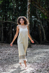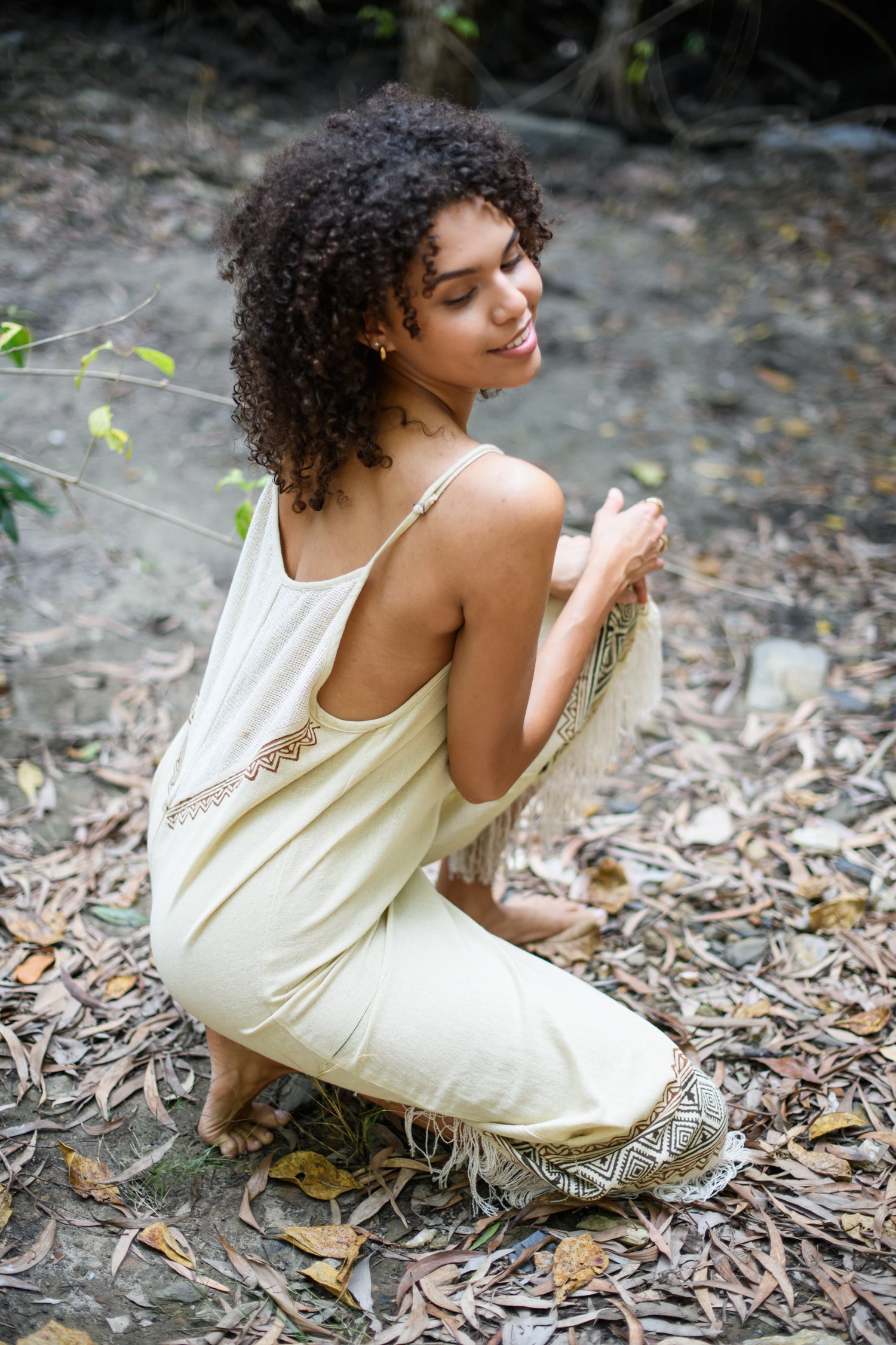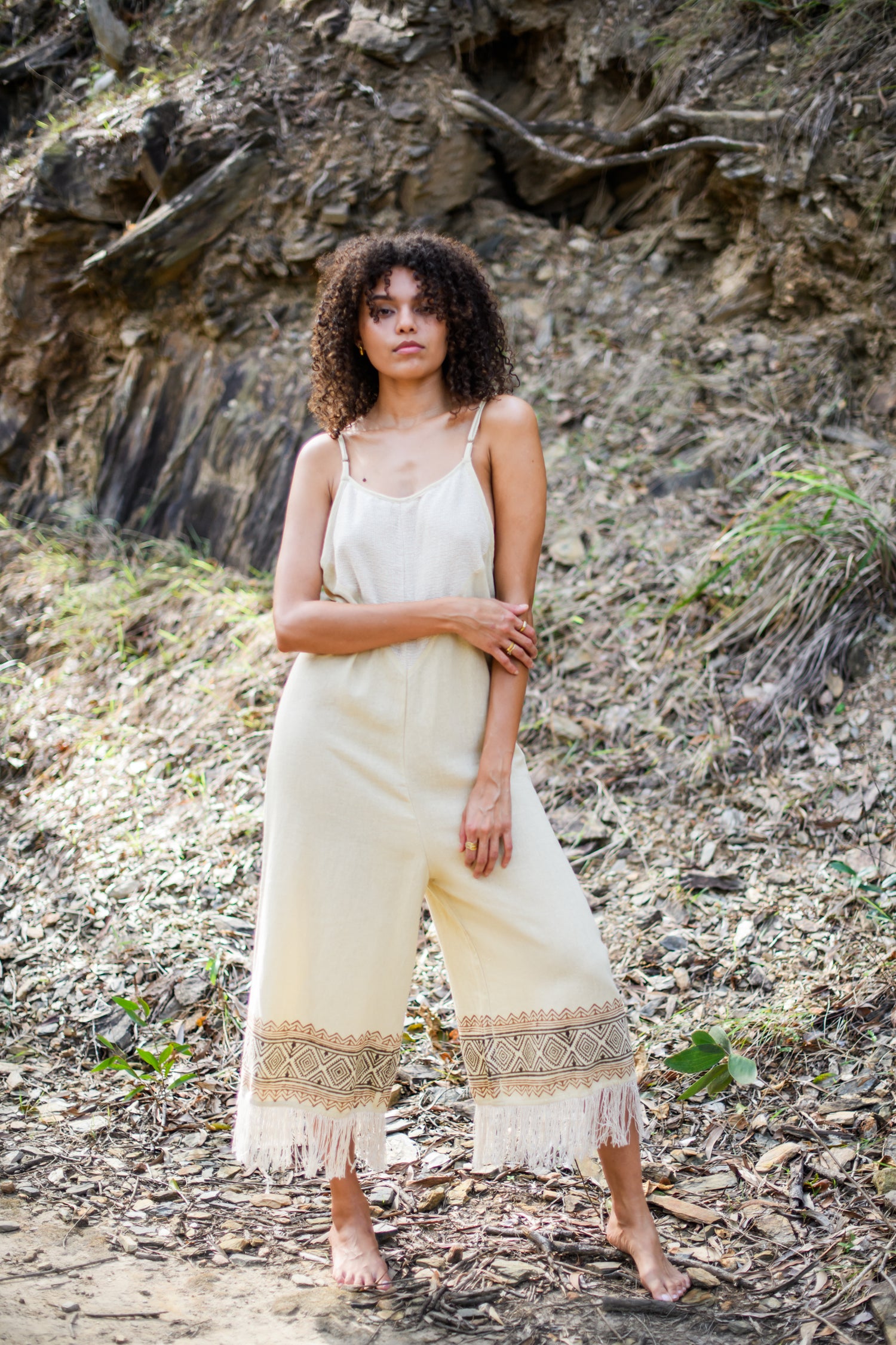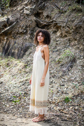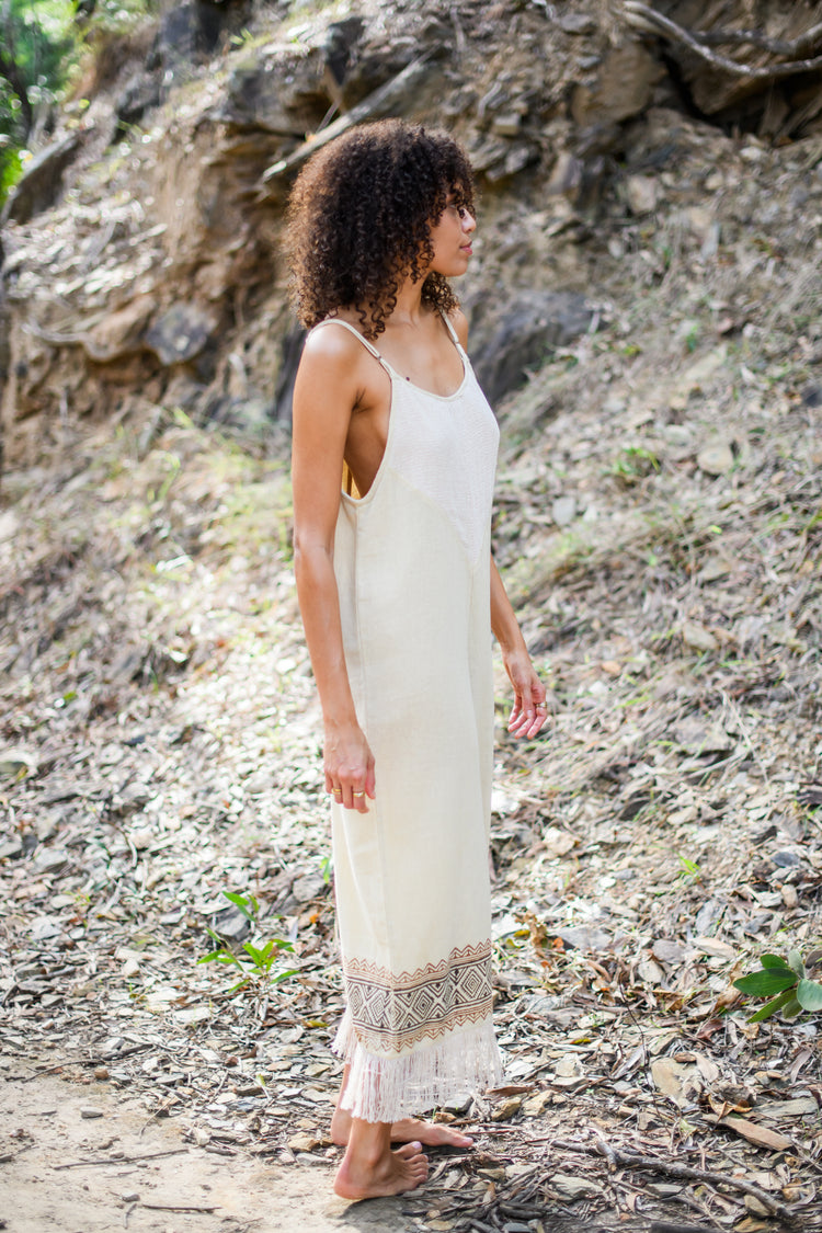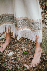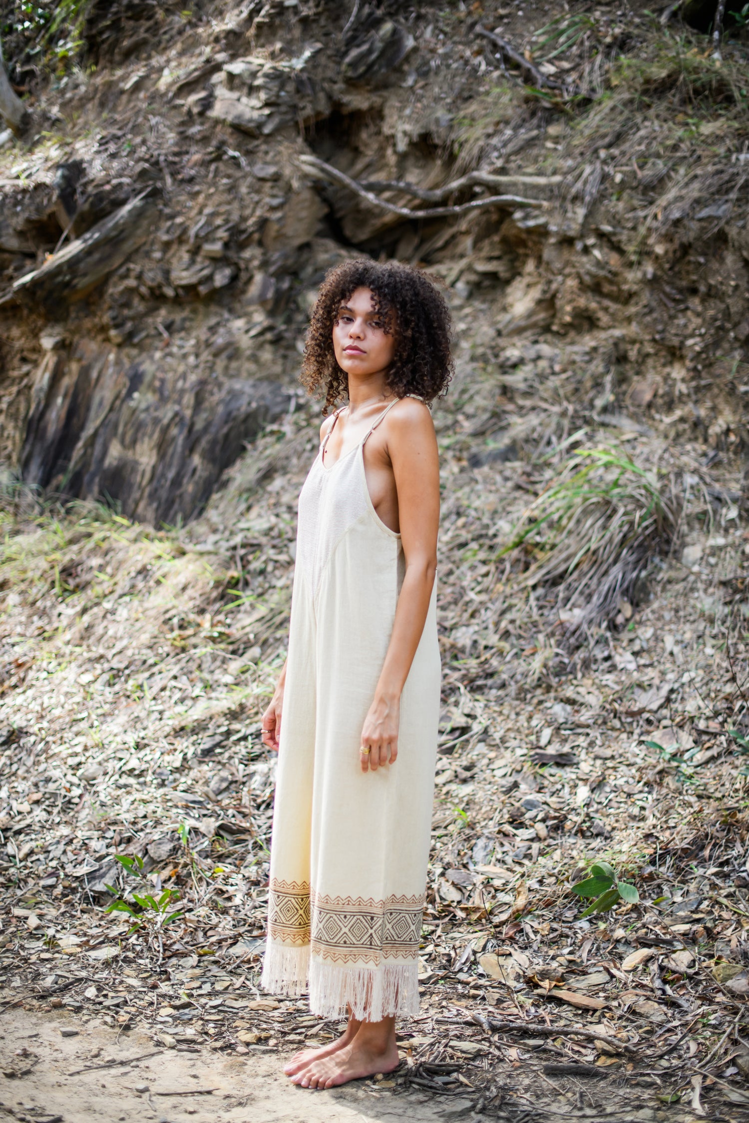 This elegant one-piece embodies a boho tribal aesthetic, crafted thoughtfully from organic raw cotton to ensure both comfort and sustainability. Featuring a striking traditional block print border, it reflects timeless artistry and cultural heritage. Ethically produced in a small artisan studio in India, each piece supports skilled craftsmanship and responsible manufacturing. Designed as a free size garment, it adapts gracefully to various body shapes while the medium-weight hand-loomed cotton fabric offers a perfect balance of durability and breathability. Ideal for those who appreciate refined style with a conscious touch.