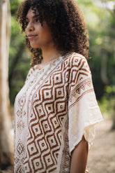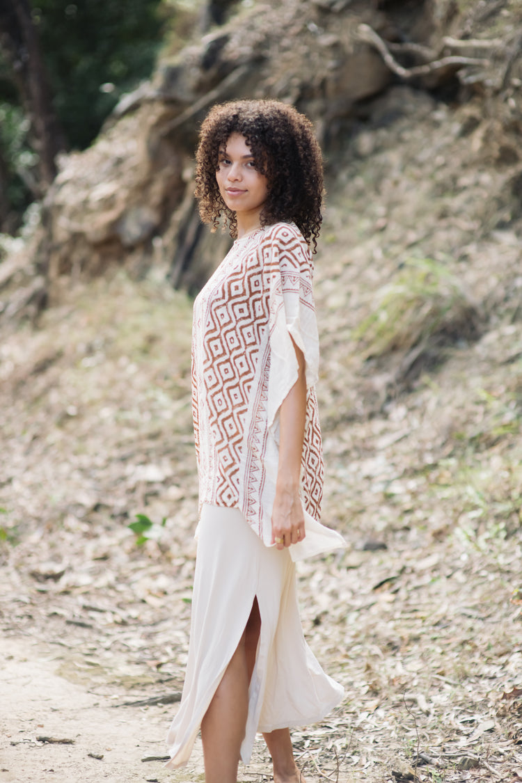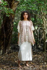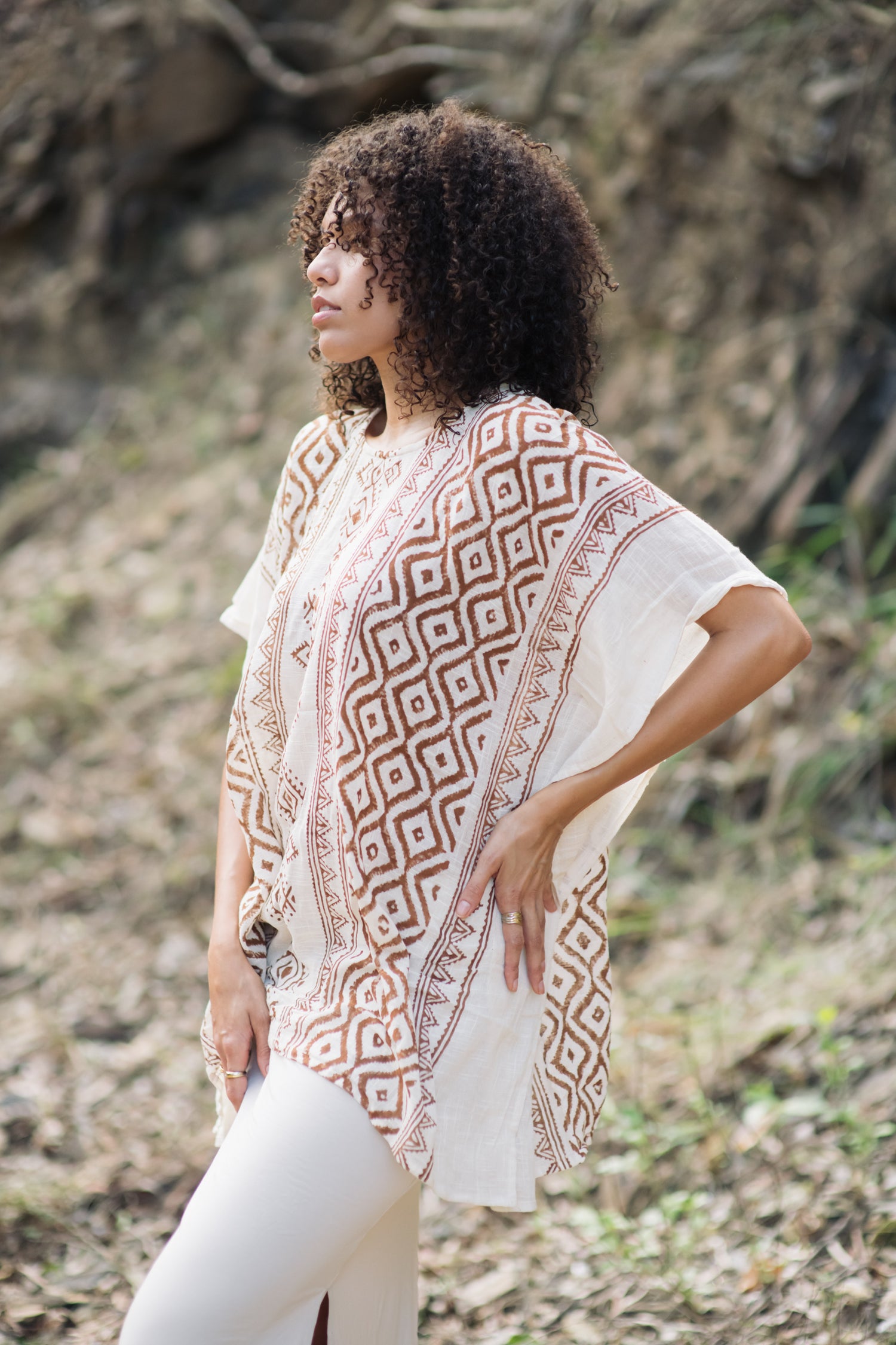 This elegant boho tribal cover-up showcases a harmonious blend of tradition and sustainability. Crafted from organic raw cotton, it features a delicately detailed traditional block print border that adds subtle artistry and cultural depth. Each piece is ethically produced in our intimate artisan studio in India, ensuring fair practices and a genuine connection to heritage craftsmanship. Designed to fit most sizes comfortably, its light-weight, cotton fabric offers breathable softness and durability. Perfect for layering effortlessly, this cover-up brings a refined yet relaxed aura to your wardrobe.