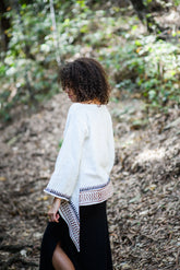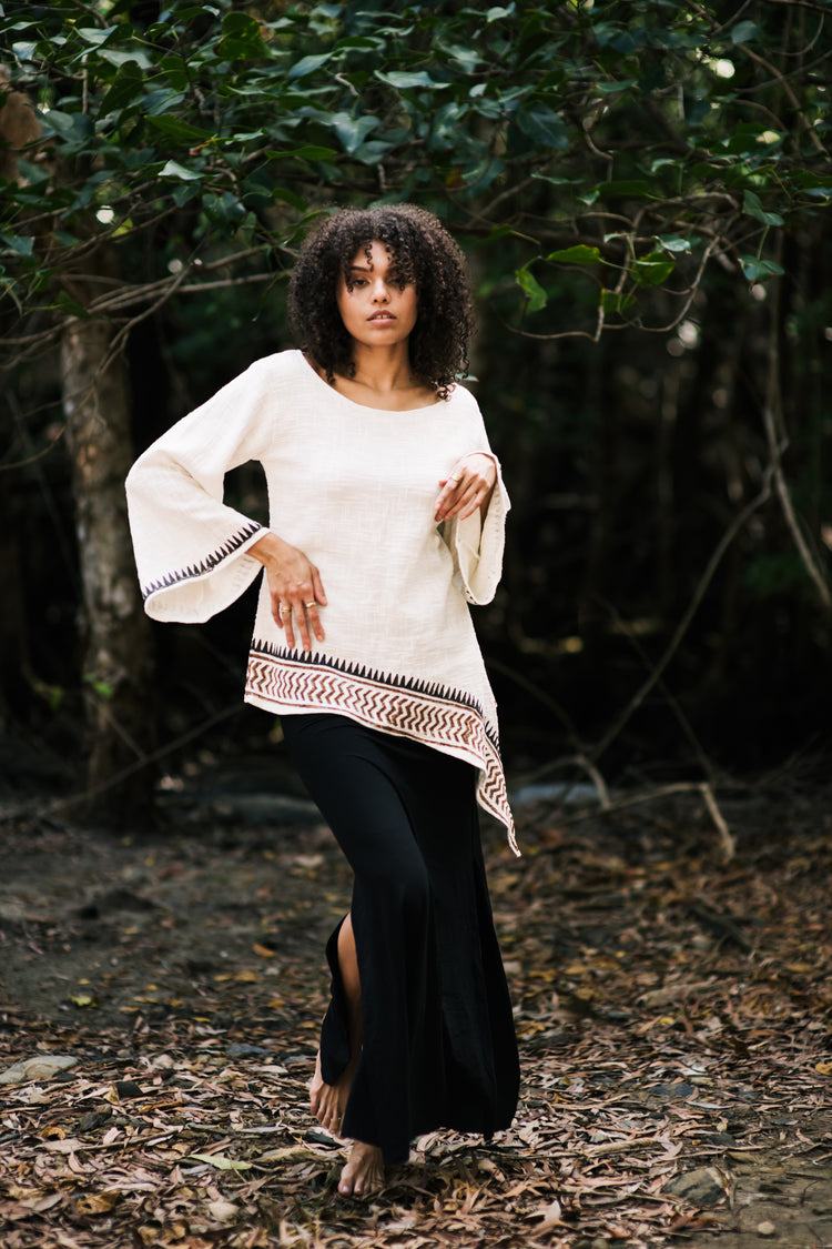 This exquisite tribal-inspired bohemian long sleeve top is crafted from 100% organic raw cotton, ensuring a natural, breathable feel that is gentle on the skin. Featuring a meticulously applied traditional block print border, each piece reflects the artistry and heritage of Indian craftsmanship. Ethically handmade with care and intention in a small artisan studio, this top embodies sustainability and authenticity. Designed as a free size, it comfortably fits various body types, made from medium to heavy weight cotton fabric that offers both durability and a refined texture. Perfect for those who appreciate thoughtful, elegant design with a conscientious story.