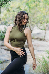 A woman wearing a green, high-necked, sleeveless yoga top and black pants, standing in a natural outdoor setting.