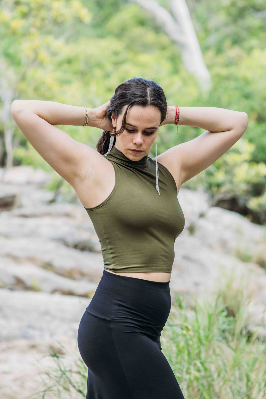 Elevate your yoga practice with the Enigma Top in Forest, a sophisticated high-neck design crafted from luxuriously soft, stretch bamboo viscose. Ethically handmade with care and intention in Bali, Indonesia, this top combines comfort and sustainability seamlessly. Its breathable fabric offers gentle support while allowing freedom of movement, making it ideal for mindful workouts or everyday wear. The model wears a size Small; please consult the sizing chart for perfect fit guidance. For a tailored look, we offer the option to extend the length upon request—simply mention your preference when ordering. Experience elegance and conscientious craftsmanship in one.