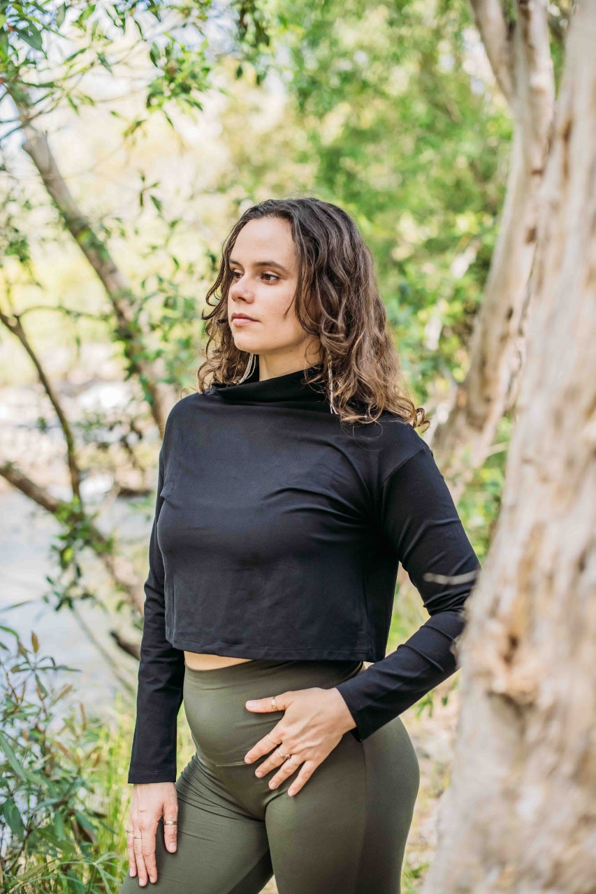 Crafted from luxuriously soft, stretch bamboo viscose, the Kyanite Long Sleeve in Black offers understated elegance with its sleek turtleneck design. Ethically handmade with care and intention in a small artisan studio in Bali, Indonesia, this piece combines sustainability with refined style. The fabric’s natural stretch ensures a flattering fit that moves comfortably with you. Designed to suit a sophisticated wardrobe, it can be customized to a longer length upon request for added versatility. The model is pictured wearing a Medium (10 AU / 6 US), showcasing its timeless and graceful silhouette perfect for any occasion.
