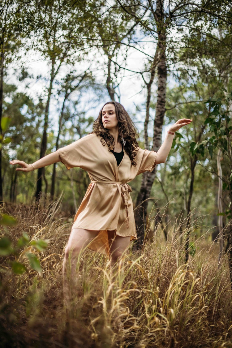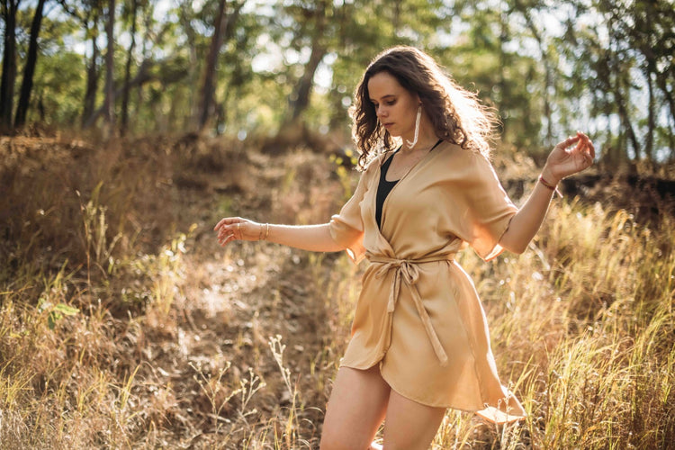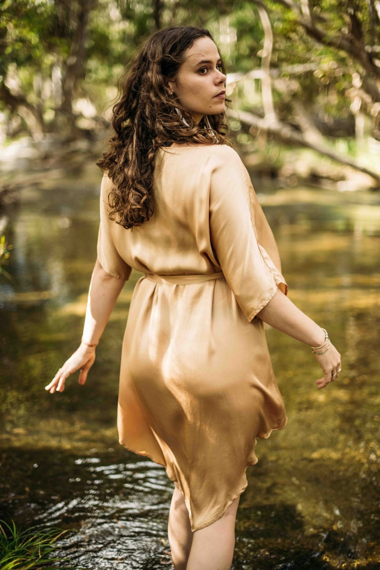 Experience the sheer elegance of this luxurious silk wrap dress with a adjustable tie up belt. Each piece is meticulously handcrafted in our boutique artisan studio in Bali, ensuring ethical practices and attention to detail. Our model is adorned in the exquisite Nude colour, in size Medium.