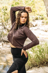 This elegant long sleeve turtleneck top, crafted from soft stretch bamboo viscose, offers both comfort and refined style. Thoughtfully handmade with care in a small artisan studio in Bali, Indonesia, it reflects ethical craftsmanship and attention to detail. The rich chocolate hue adds a sophisticated warmth, perfect for elevating your wardrobe. Designed to flatter with a sleek, form-fitting silhouette, the model features a Medium (10AU/6 US). For a personalized fit, the length can be extended upon request—simply specify when placing your order to ensure your ideal style and comfort blend seamlessly.