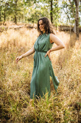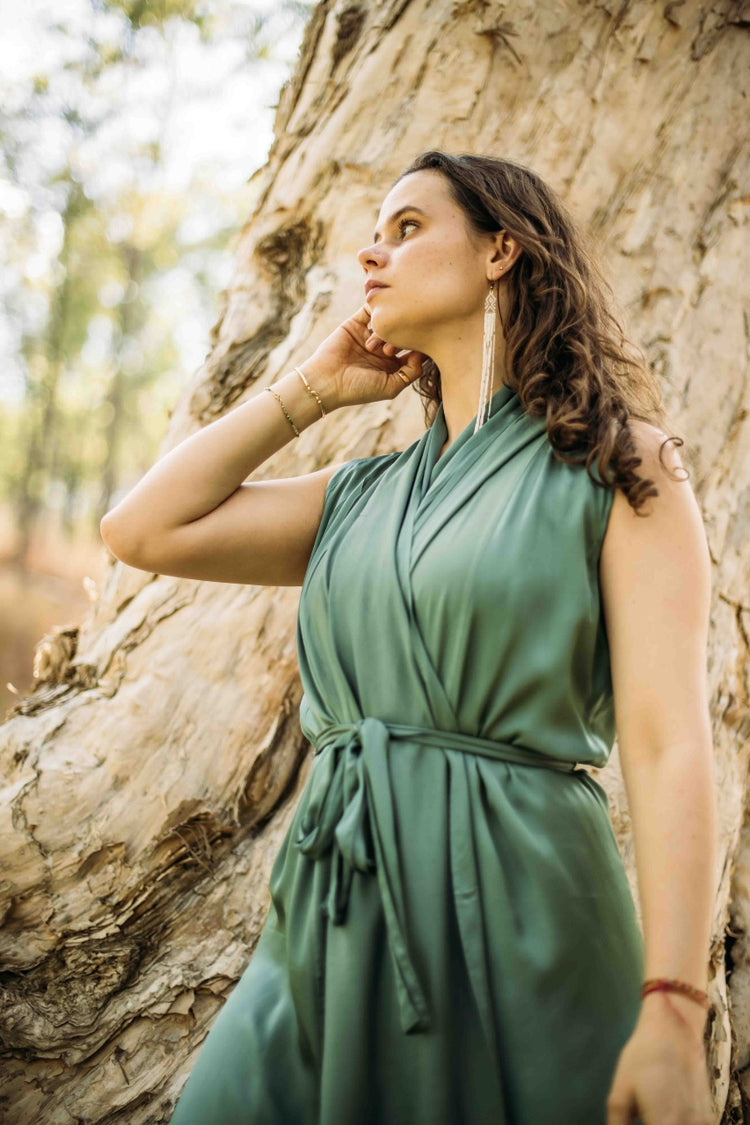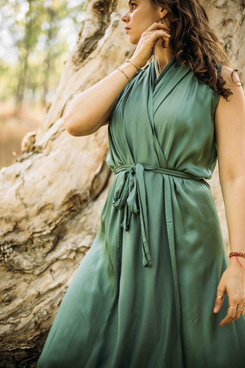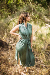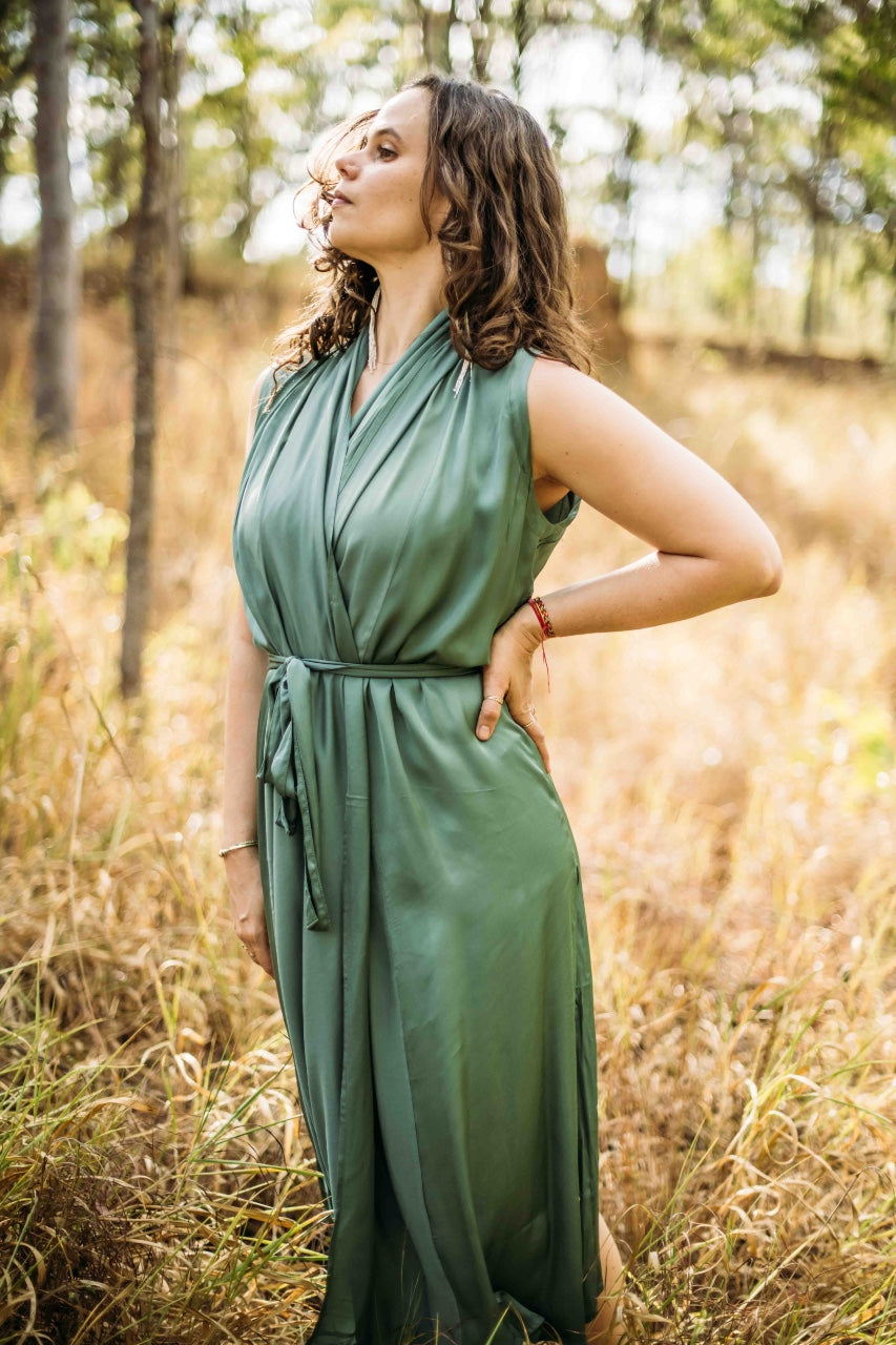 Elevate your wardrobe with the Majestic Wrap Dress in luxurious silk, showcased in a serene Aqua hue. This exquisite maxi dress features double side splits that offer graceful movement and a hint of allure, perfect for both refined daytime occasions and elegant evening events. Each dress is meticulously handcrafted in our boutique artisan studio in Bali, reflecting a commitment to ethical production and exceptional craftsmanship. The wrap design flatters the silhouette, providing a customizable fit that enhances comfort without compromising style. Experience timeless sophistication woven into every detail of this stunning piece.