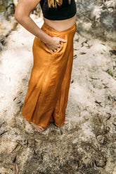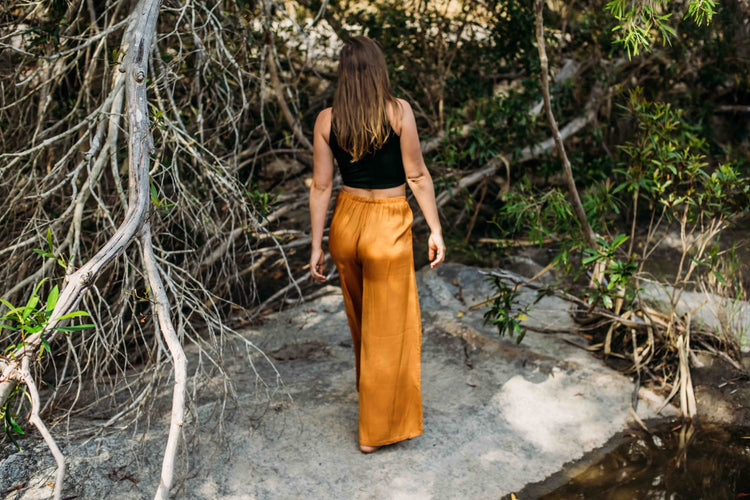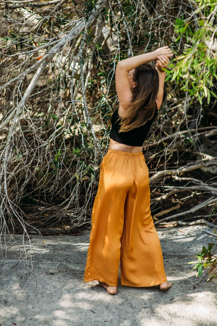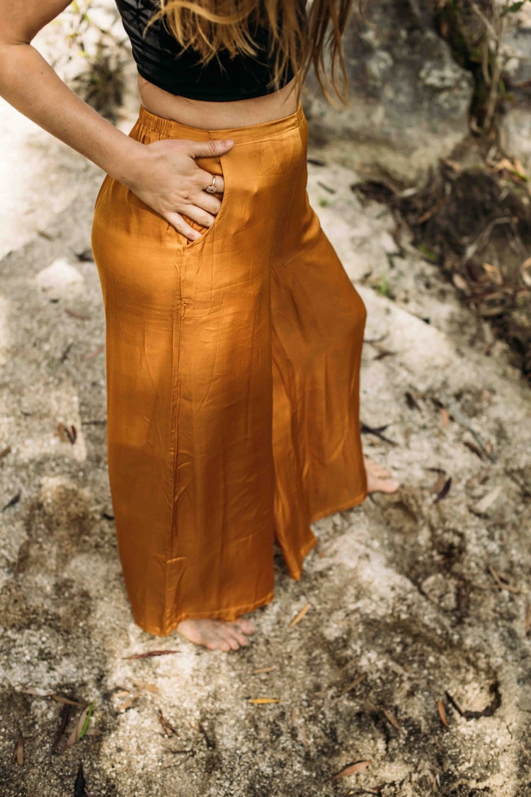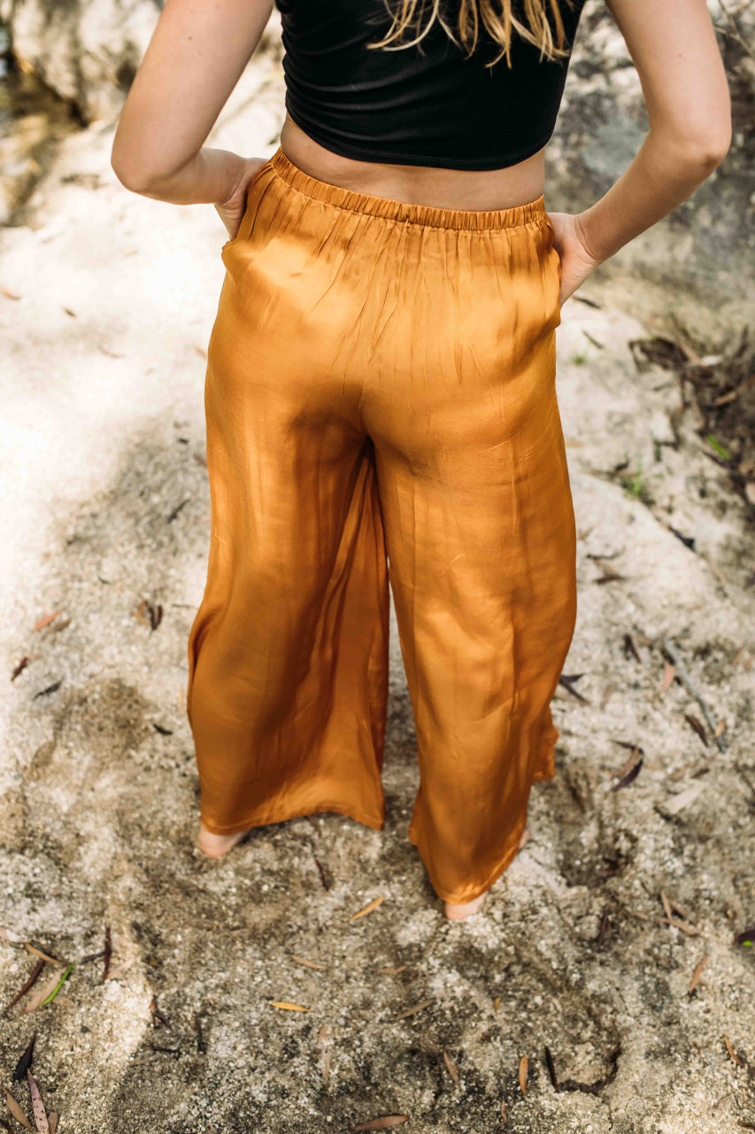 These high-waisted Kundalini pants combine effortless elegance with thoughtful design. Crafted from luxurious silk, they drape beautifully while offering a breathable, soft touch against the skin. The loose, boho-inspired silhouette allows for comfortable movement, while the practical pockets add a subtle functionality. Ethically handmade in Bali, Indonesia, each pair reflects a commitment to mindful craftsmanship and intentional artistry. Perfect for those seeking refined comfort and a unique statement piece, these pants elevate any wardrobe with their graceful flow and exquisite material. The model features a size Small 8 AU/4 US in a warm Copper hue.