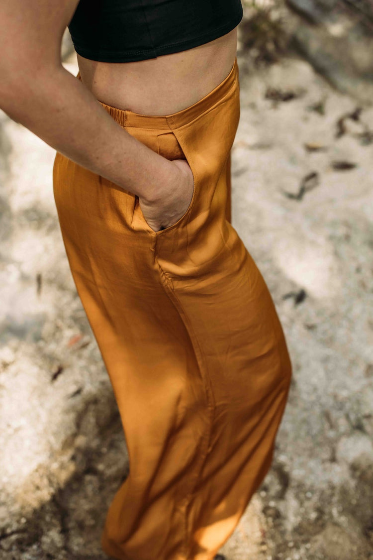 A person standing on a beach wearing high-waisted orange silk pants with pockets.