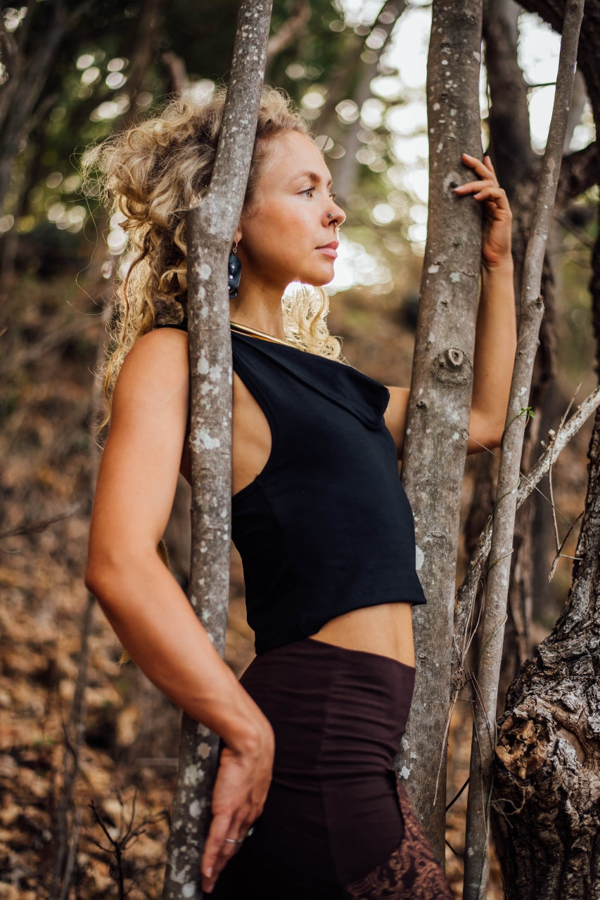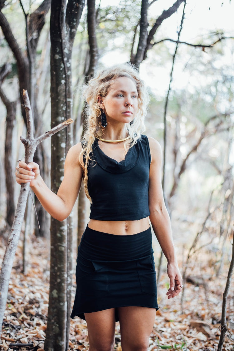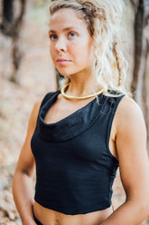 A woman wearing a black cowl neck top with no sleeves, made from stretchy bamboo viscose, in an outdoor setting.