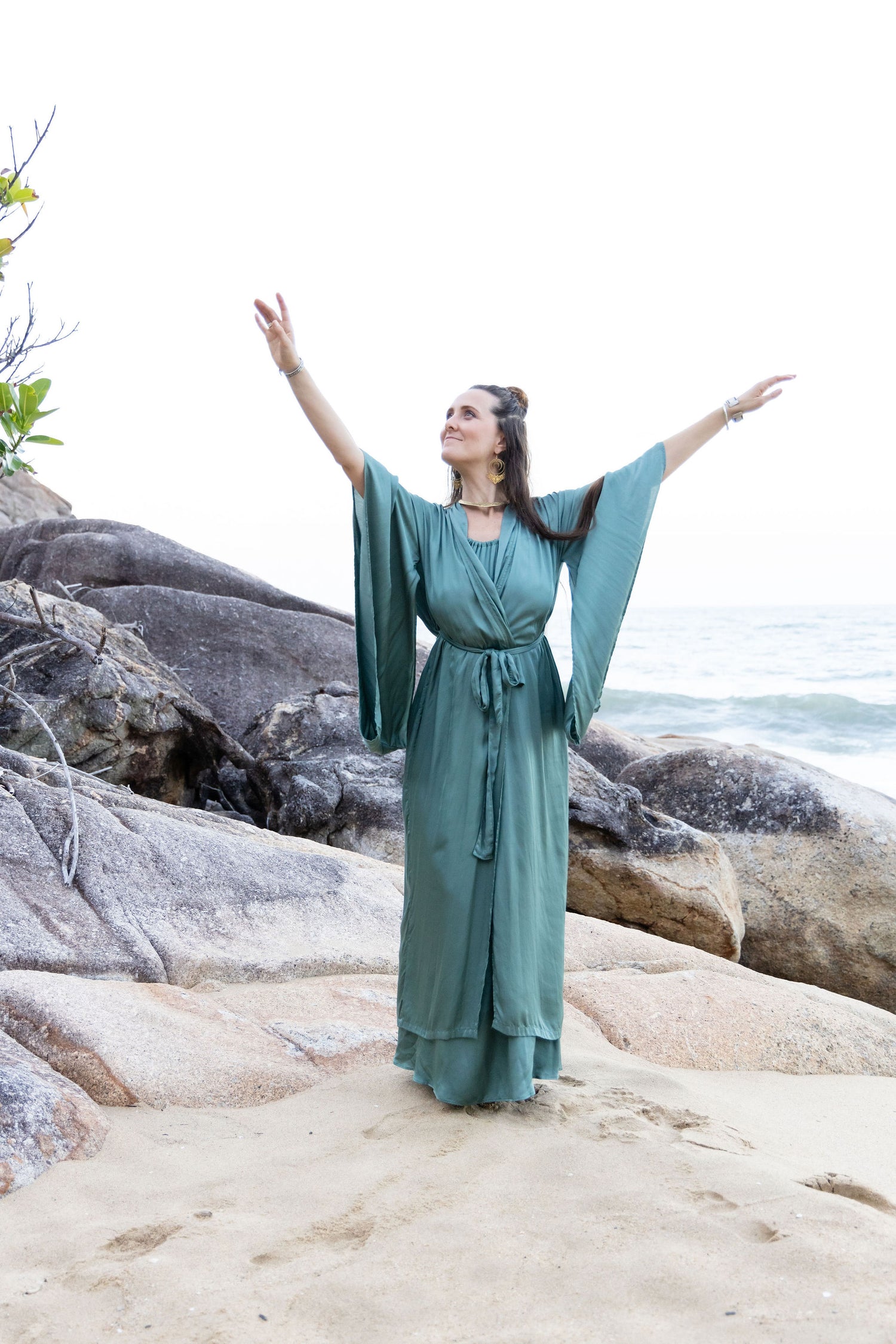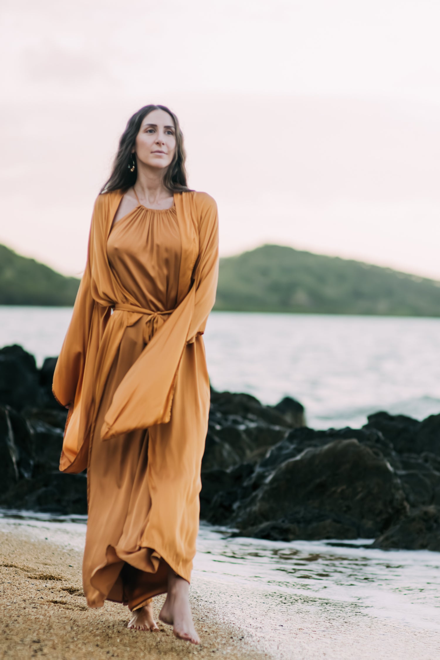 Discover refined elegance with this handcrafted silk kimono robe. Meticulously hand crafted by skilled artisans in our Bali studio, each piece reflects our commitment to ethical craftsmanship and exceptional quality. The stunning Copper hue exudes timeless sophistication, while the versatile design seamlessly transitions from intimate moments to leisurely afternoons. A curated addition to any discerning wardrobe, this luxurious robe invites you to embrace understated beauty and graceful comfort.